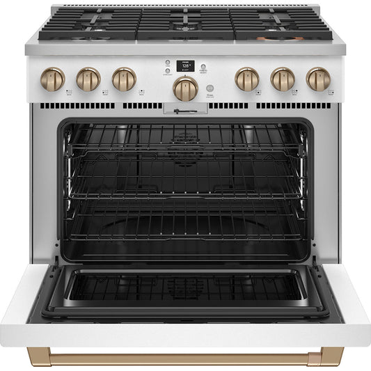 Café 36" Smart Dual-Fuel Commercial-Style Range with 6 Burners – Matte White with Brushed Bronze Accents